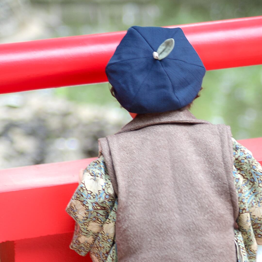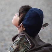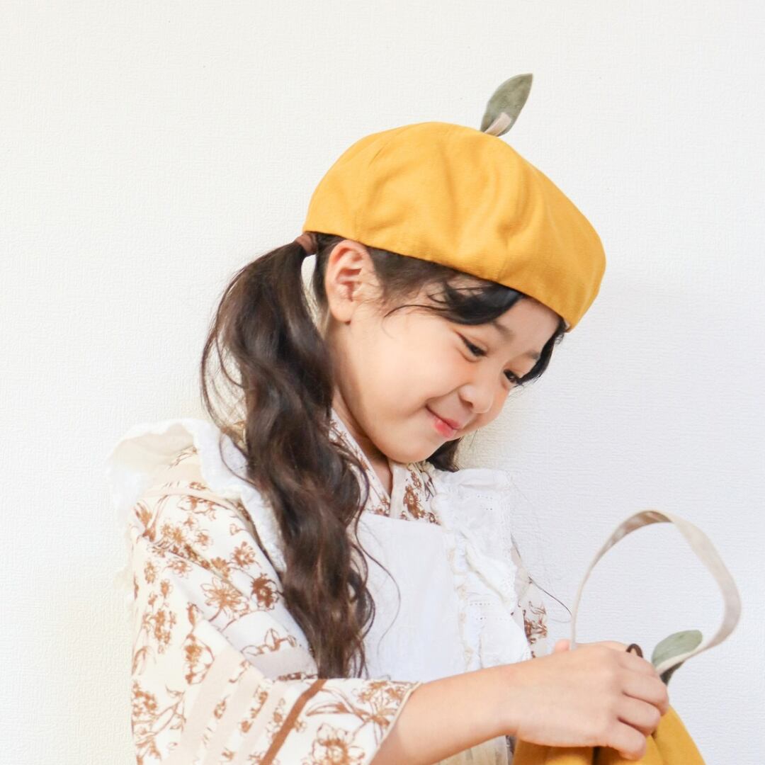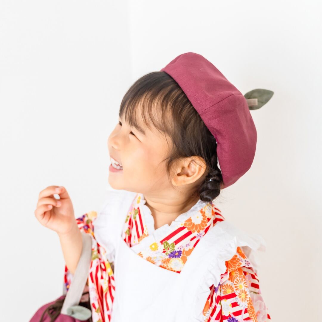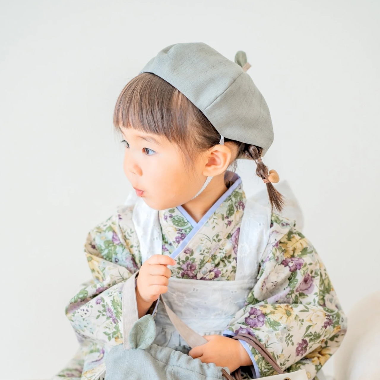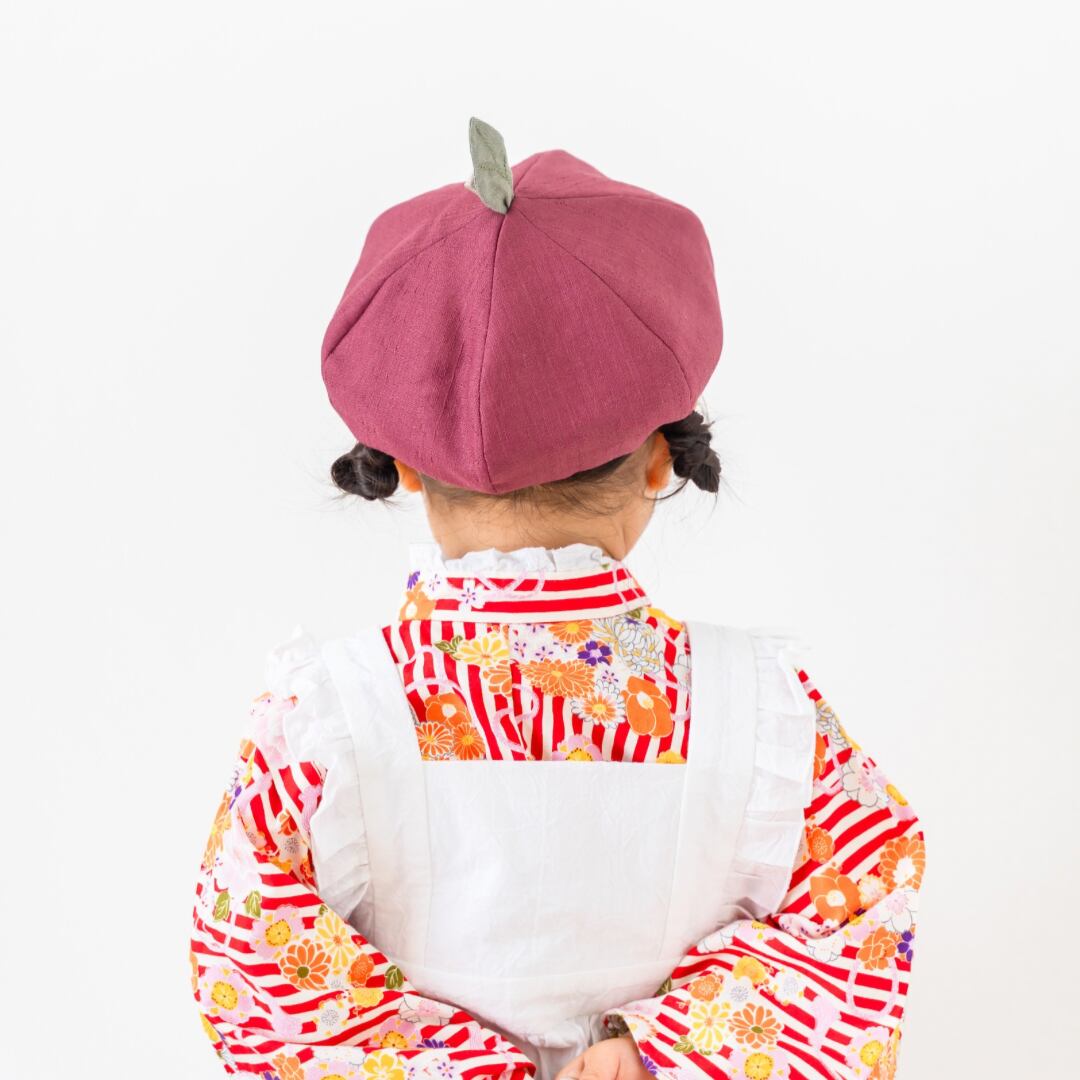 色合わせが難しいお着物でも、ベレー帽を被るだけで