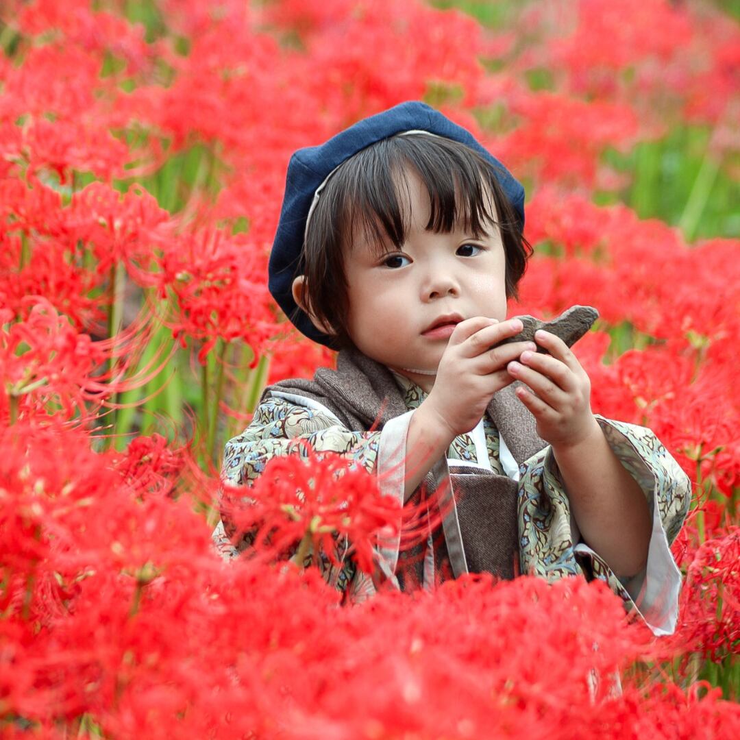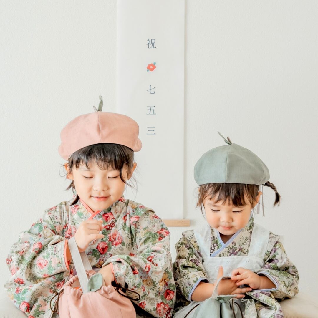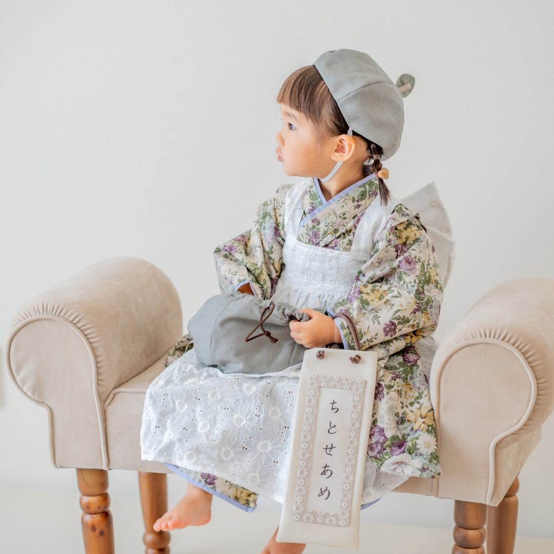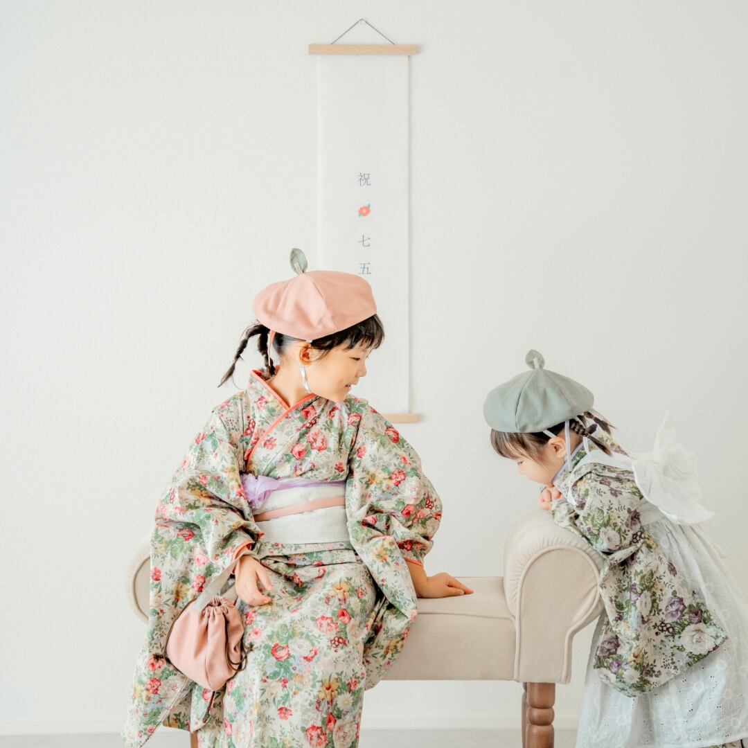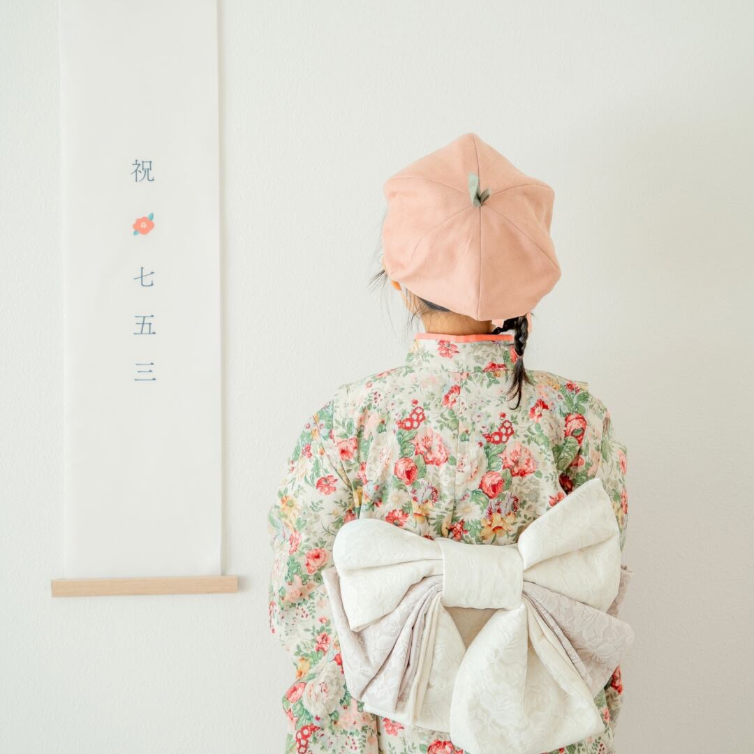 色合わせが難しいお着物でも、ベレー帽を被るだけで