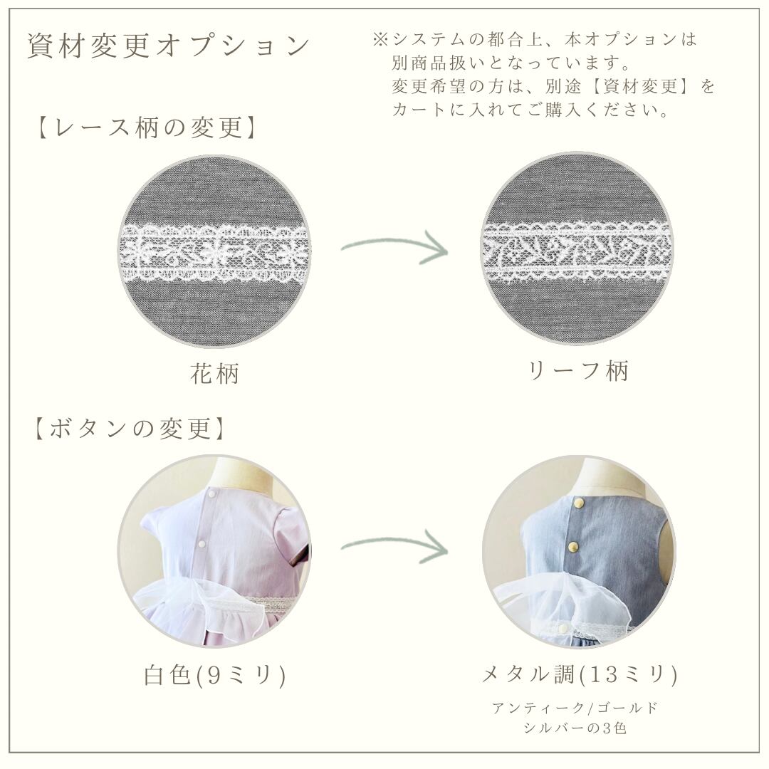 レースの柄の変更を希望される場合、ボタンの変更と同様に、【資材変更】をカートに入れて、そちらからレースの柄をご指定ください。